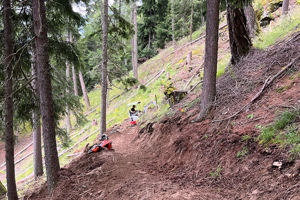 Am Vormittag werden wir in kleinen Gruppen etwa 2–3 Stunden an verschiedenen Trailabschnitten arbeiten. Dabei zeigt sich schnell, ob die Idylle aus Trailbau-Videos der Realität standhält.